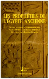 Collection "Égypte ancienne"  N°4 Les prophéties de l'Égypte ancienne, "Textes traduits et commentés par André Fermat et Michel Lapidus, Directeur de l'Institut Ramsès" | " Ce qu'avaient prédit les ancêtres est advenu : la terre est remplie de gangs, le crime est partout, les grands ne peuvent plus fraterniser avec le peuple, le coeur des hommes est violent, le rire s'est éteint, aucune voix ne peut être juste pendant ces années de tumulte, la faim empêche la fraternité, le coeur de l'homme ne se préoccupe que de lui-même, le pays sera amoindri mais ses chefs seront nombreux, les impôts considérables, la lumière s'éloignera de l'espèce humaine... "